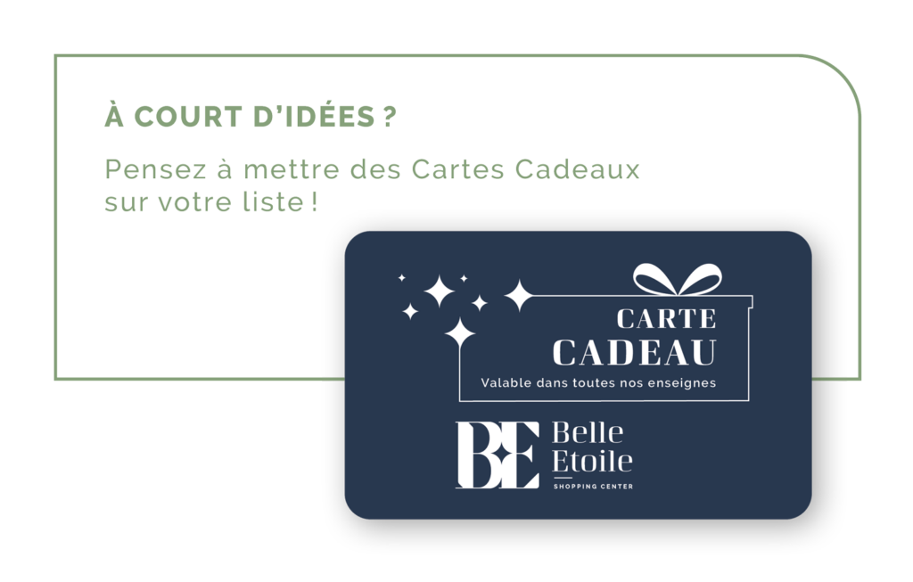 Et si les idées manquent, pensez à la Carte Cadeau Belle Etoile ! Elle est la solution magique qui vous permettra de choisir ce qui vous fera plaisir dans l’ensemble des magasins du centre commercial.