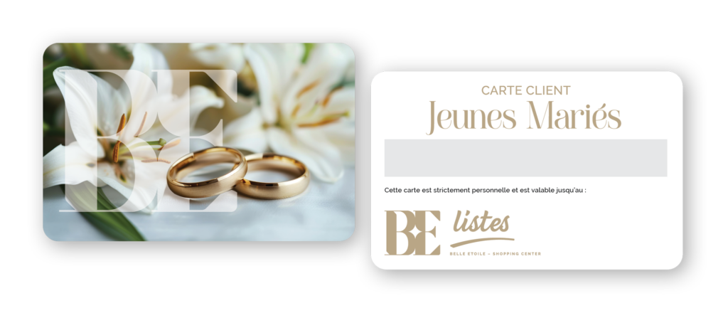 Une carte pour chaque marié(e) avec laquelle vous profiterez d’avantages et de remises particulières au supermarché Cactus Belle Etoile et dans de nombreux magasins du shopping center pendant toute une année.
